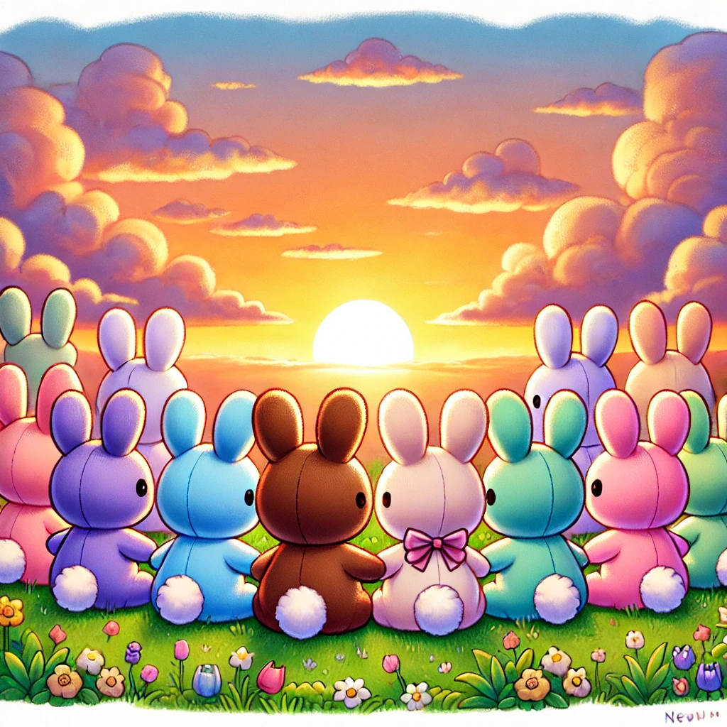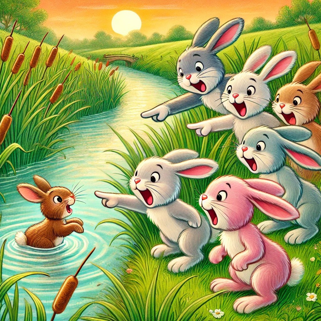 As the sun began to set, Bella saw a group of magical bunnies gathering on a hill. They were her colourful cousins, who lived in a meadow filled with flowers. Bella told them about Benny, and they all decided to help. They spread out, searching high and low, following the stream where Benny had floated.