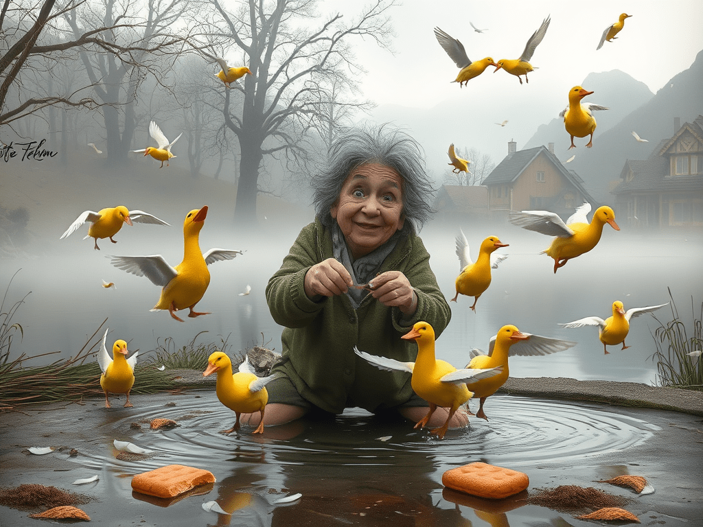 One misty morning, Granny Harmer awoke with a start. She had dreamed of eagles soaring majestically over the village and resolved that she, too, would achieve greatness by teaching her ducks to fly like those regal birds. She bustled about her cluttered kitchen, rummaging through dusty cupboards for anything that might aid her grand endeavour: some old string, a jar of glue, and a half-eaten biscuit.