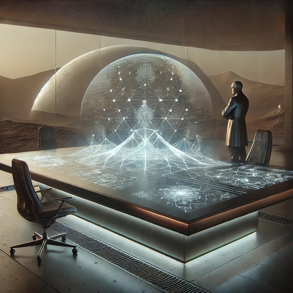 Dr. Daneel Olivaw’s office in Musk City, a striking blend of Martian redstone and translucent alloy, was a sanctuary of order and intellect. Outside the domed windows, the Martian skyline stretched in delicate shades of rust and gold, framed by the shimmering protective barrier of the city. Inside, the room was quiet except for the faint hum of processing units concealed within the walls.